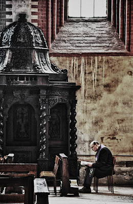 Not sure if it was confession session, but this priest was sitting alone outside the confession box, maybe he was waiting for someone to turn up to make confession or maybe he was there just to pray....